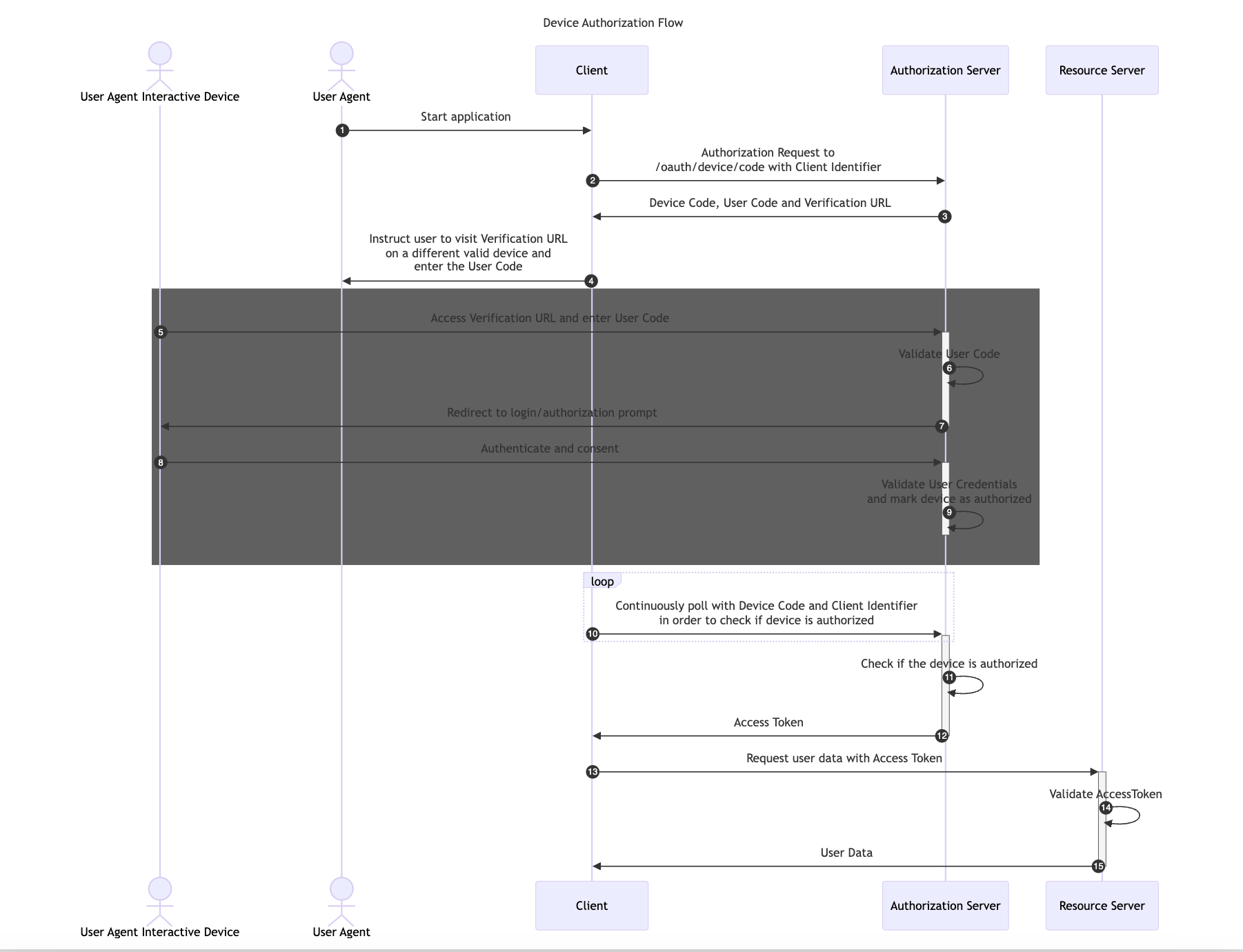 In this flow, first the Client application retrieves a User Code and Verification URL from the Authorization Server. Then, it instructs the User Agent to Authenticate and Consent with a different device using the provided User Code and Verification URL.